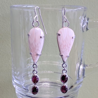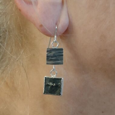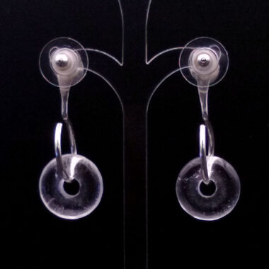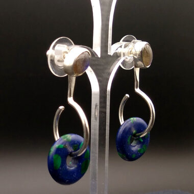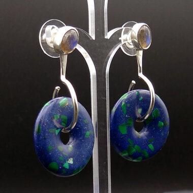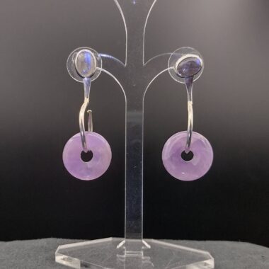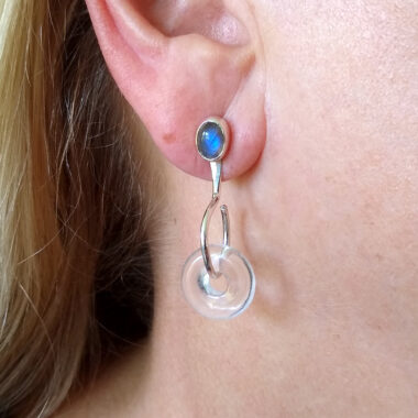 Set oorknoppen van zilver met ovale labradoriet, een sterke spirituele steen. Daarbij een zilveren haakje waar een pi-schijfje van amethyst, een spiritueel veelzijdige steen, aan hangt. Het is mogelijk om de oorknoppen te dragen zonder haakje en de schijfjes zijn wisselbaar. Zo kan je elke keer een andere look creëren.