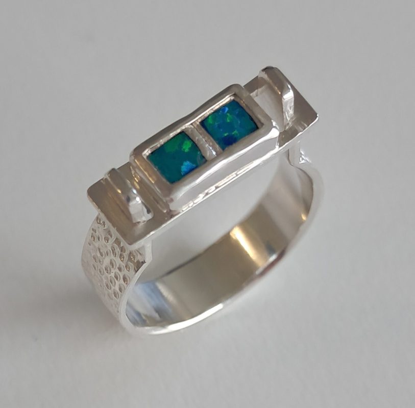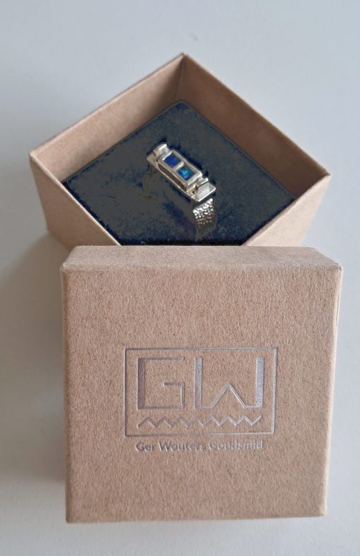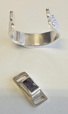 In opdracht ontwikkel ik een ring die niet over de knokkels van een vinger hoeft als deze verdikt zijn. Een normale ring zou dan te groot zijn op de plek waar je de ring draagt. De ring heeft een opening waar je je vinger doorheen schuift. Met een soort afdekplaatje sluit je de ring af. Voor deze klant heb ik de ring voorzien van steentjes uit een van haar eigen ringen die ik omsmelt. Het is geen alledaagse ring en ook niet om dagelijks te dragen. Een designring voor de bijzondere momenten.