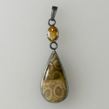Een vintagelook hanger met een gecabochoneerde versteend koraal en een gefacetteerde citrien.