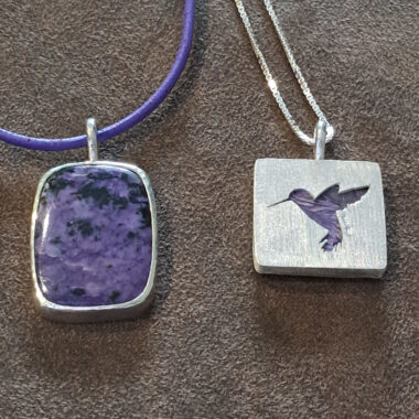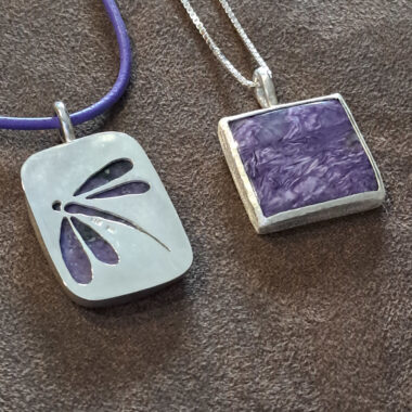 Een robuuste en bijzondere hanger met charoiet.