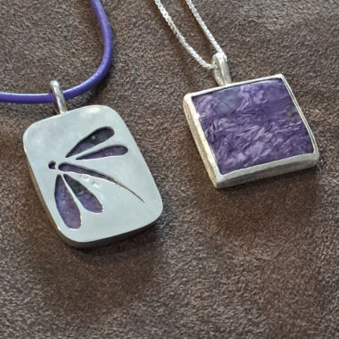 Deze hanger heeft een prachtige, rechthoekige charoiet en is gezet met een lichte hamerstructuur in het zilver.