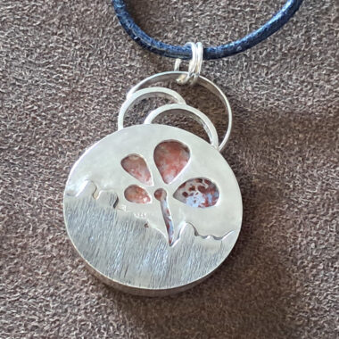 Deze unieke zilveren hanger is voorzien van een opaal uit Indonesië. Het is een variëteit van een gewone opaal met allerlei andere mineralen erin die de kleuren geven. De ronde hanger heeft een drietal halve hoops waar het hangeroog aan zit. Aan de achterzijde een opleg en een gestileerd klavertje vier.