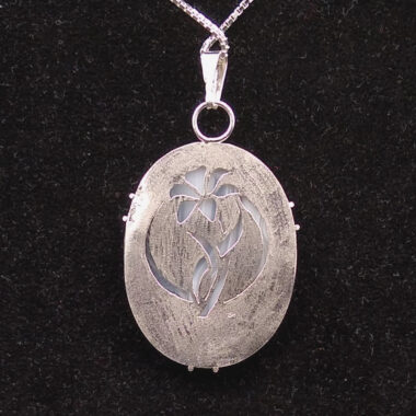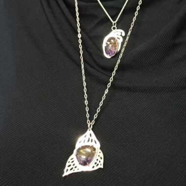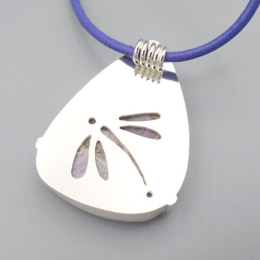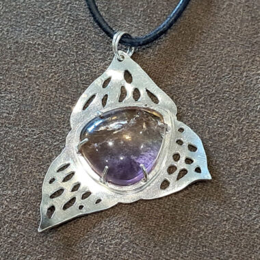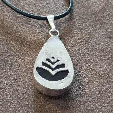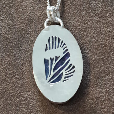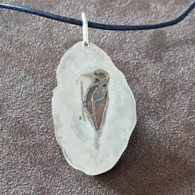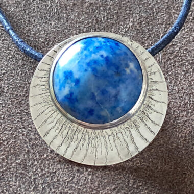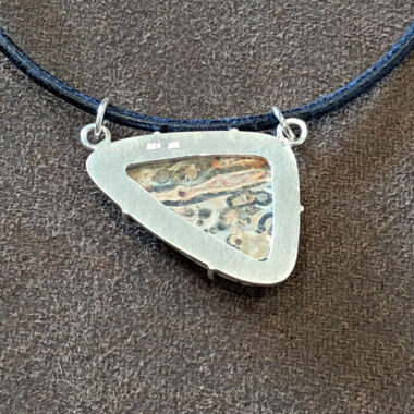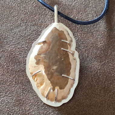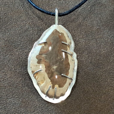 Een grote hanger met een bijzondere gecabochoneerde versteend hout.