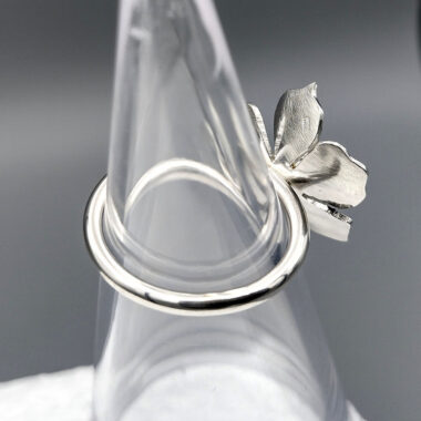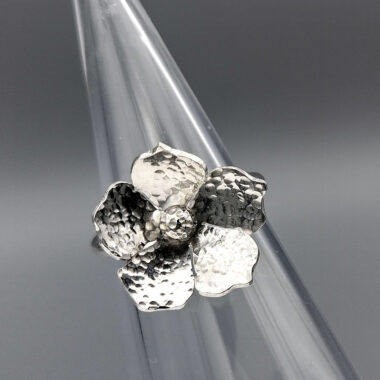 De ring is gemaakt van sterling zilver ronddraad. Ook de bloem is sterling zilver. De ringmaat van de ring op de foto is 17 mm.